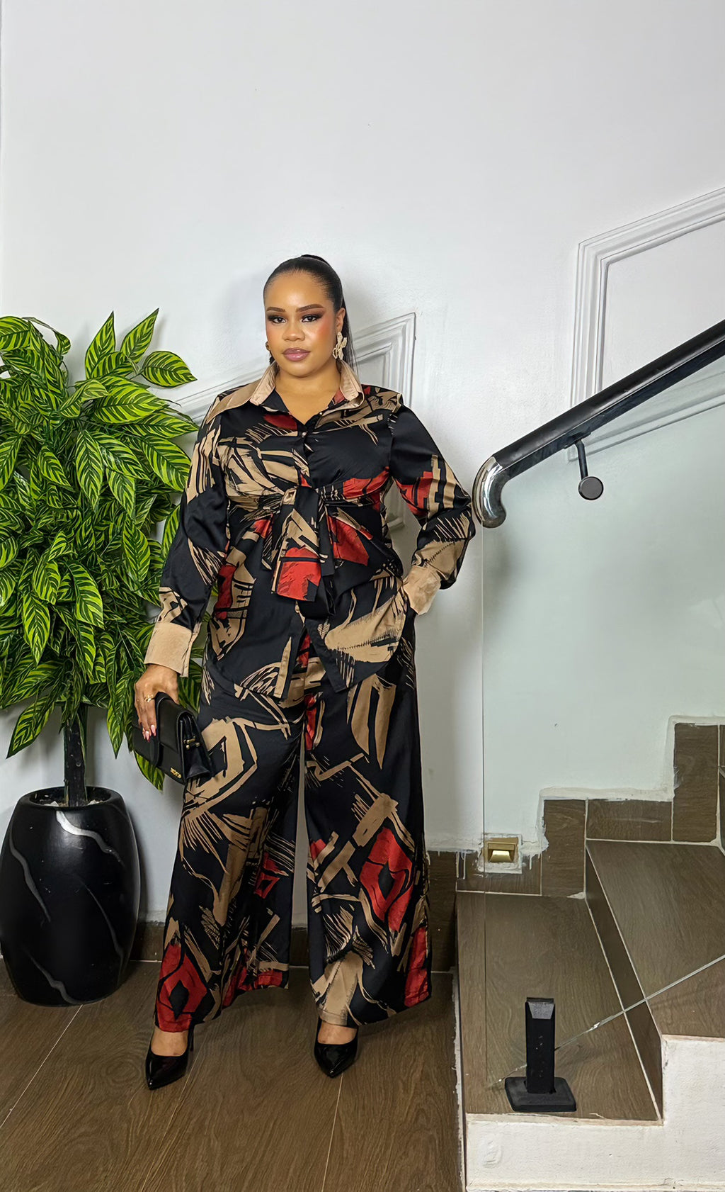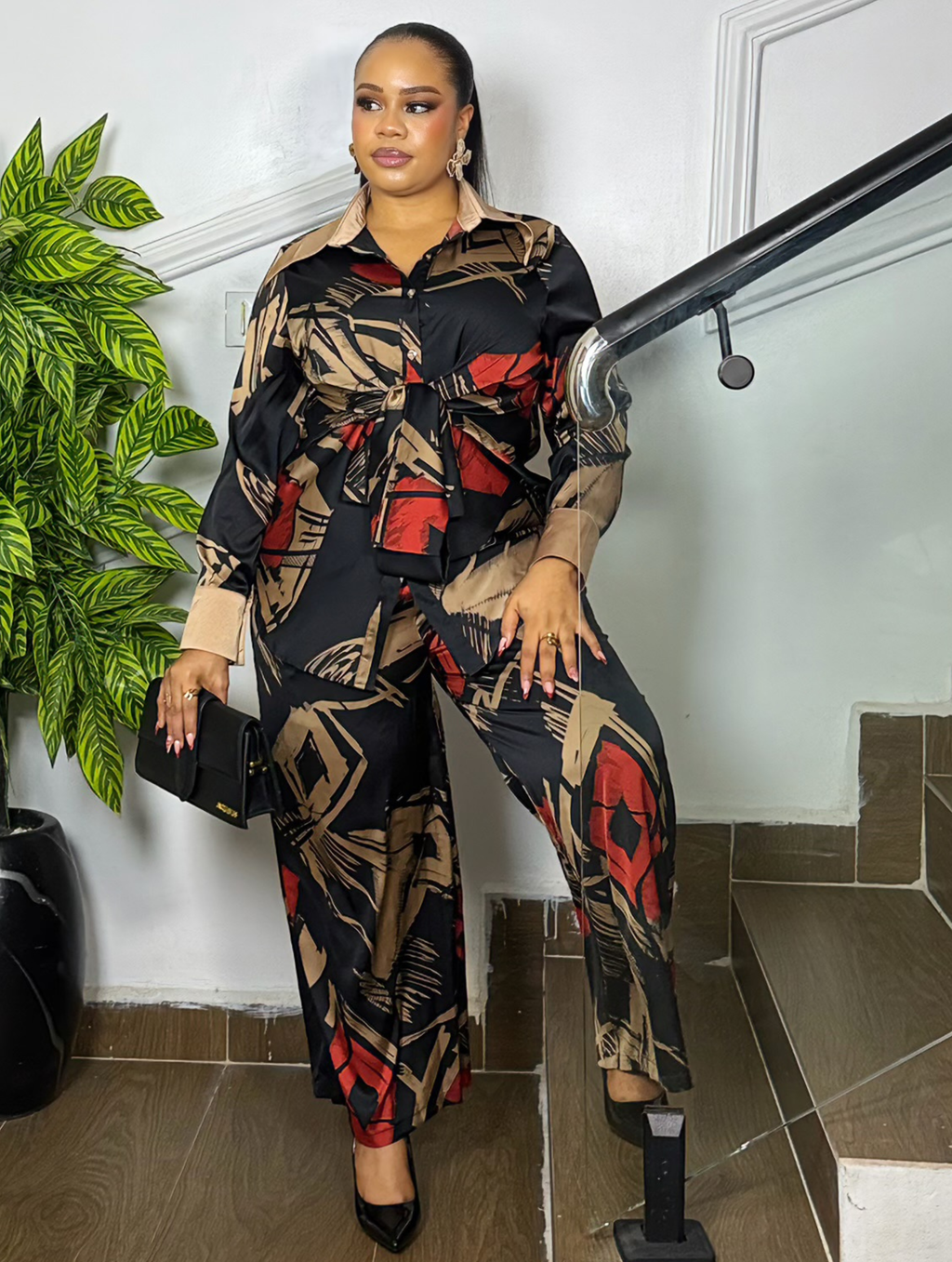 A luxurious silky 2-piece set featuring a button-up long sleeve shirt with a flattering tie-front detail and matching wide-leg pants. Soft, classy, and effortlessly stylish—perfect for brunch, dinners, birthdays, and vacation looks.