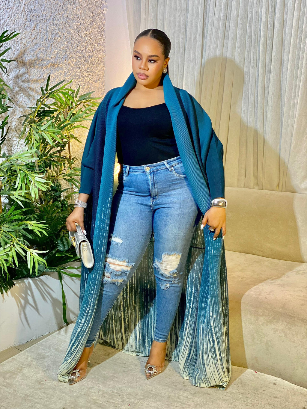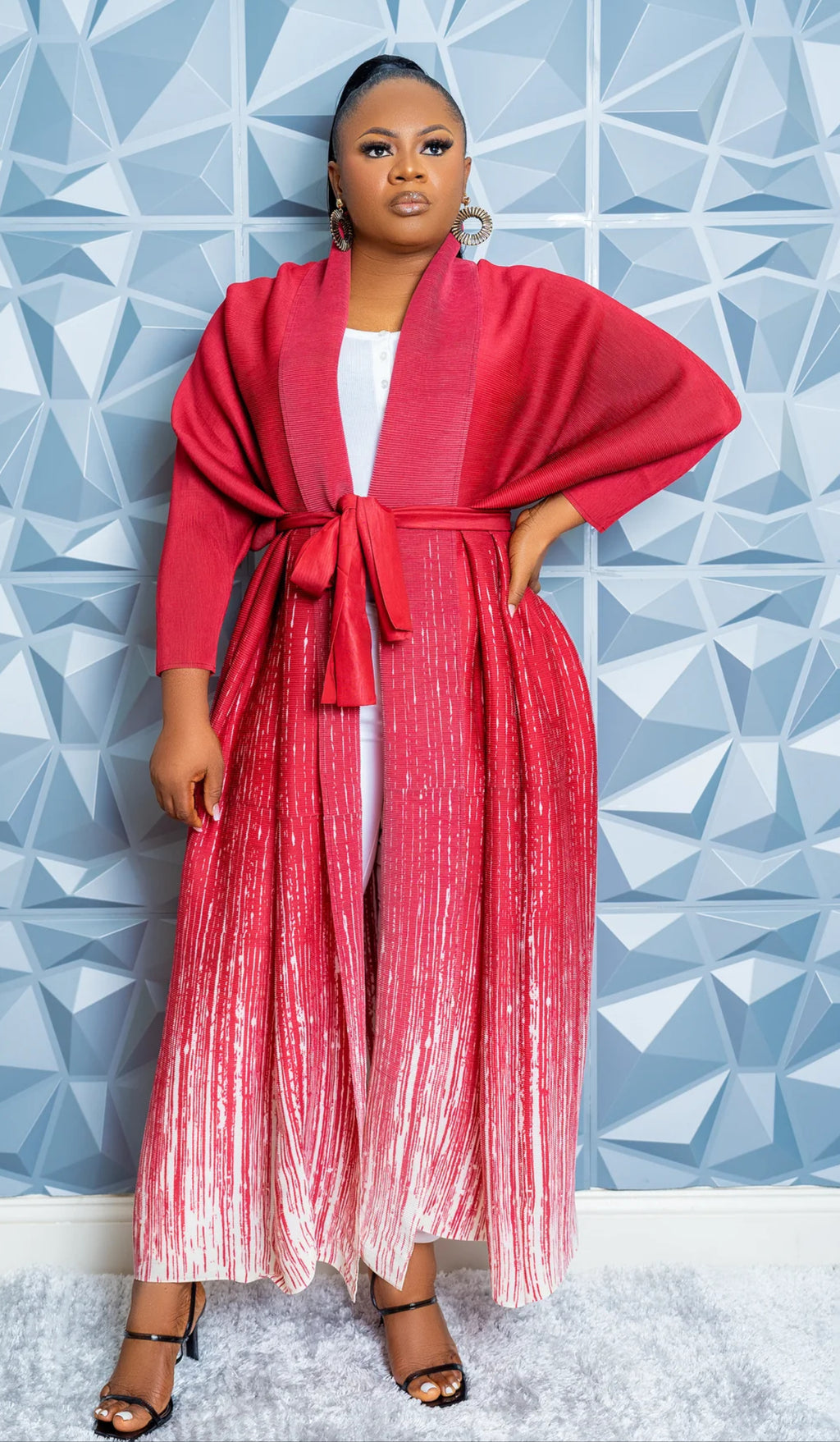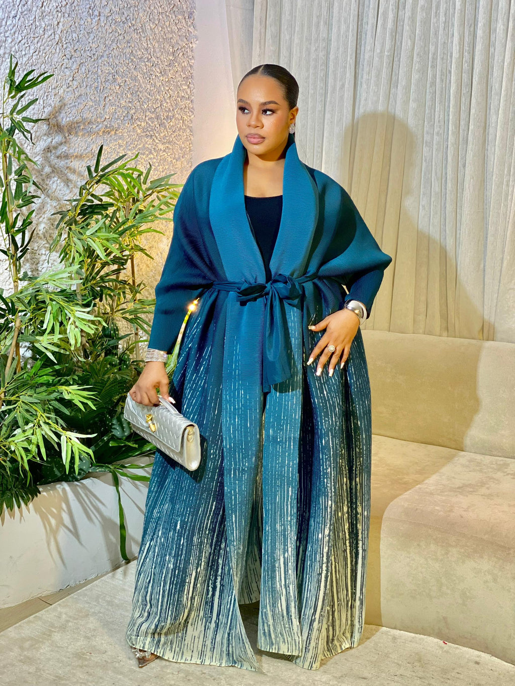 This versatile robe effortlessly blends elegance and comfort with its striking ombre design and flowing silhouette. Perfect for any occasion, it can be dressed up with heels and accessories for a formal look or dressed down with casual flats for everyday chic. A timeless wardrobe staple for modern women.