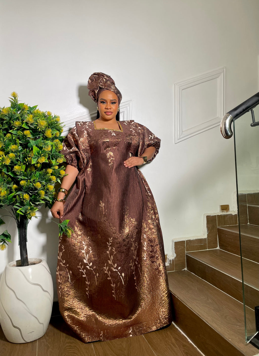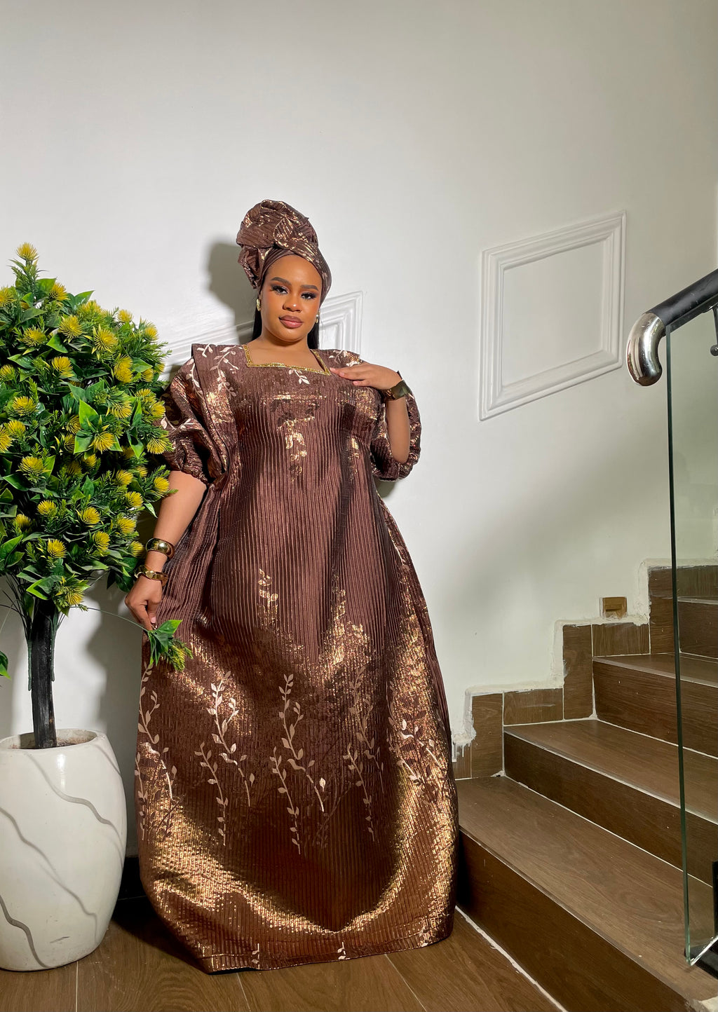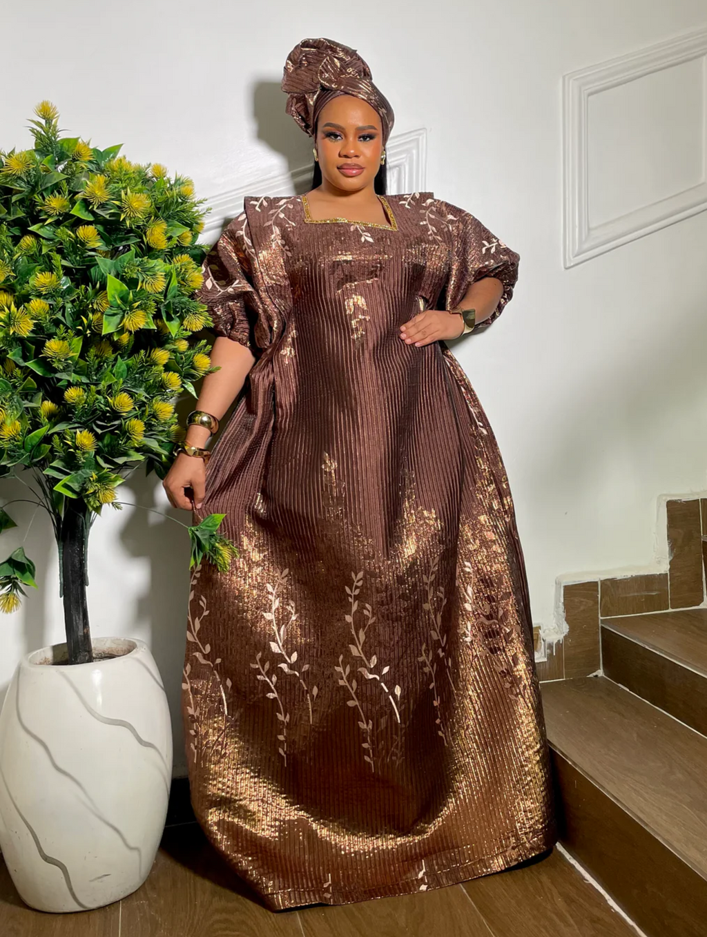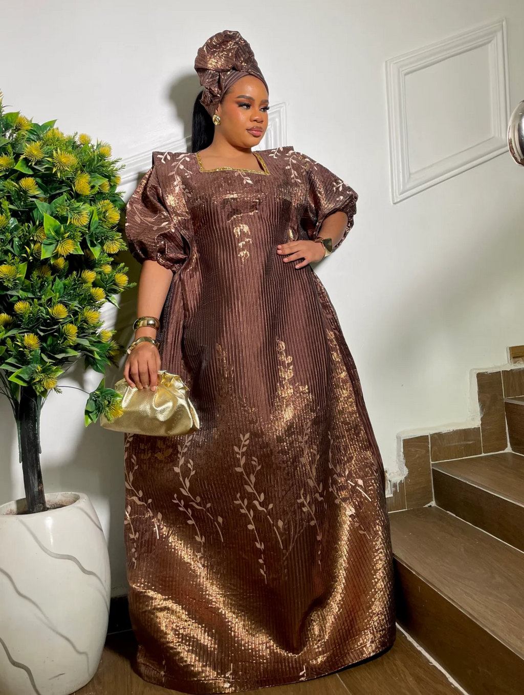 This elegant bubu is crafted from rich brocade fabric with a stunning gold sheen. It features an amber inner belt by the side that allows you to cinch the waist to your desired fit. Comes complete with a matching headscarf you can style to your preference—perfect for making a graceful, luxurious statement at any event.