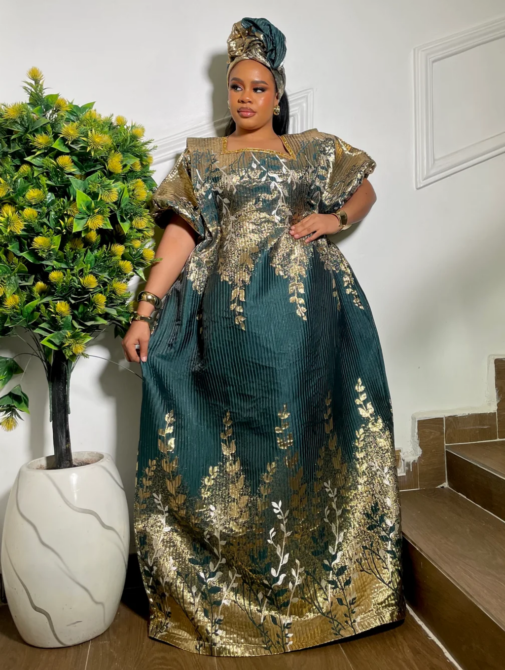 This elegant bubu is crafted from rich brocade fabric with a stunning gold sheen. It features an amber inner belt by the side that allows you to cinch the waist to your desired fit. Comes complete with a matching headscarf you can style to your preference—perfect for making a graceful, luxurious statement at any event.