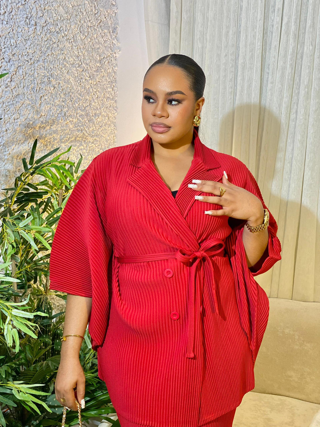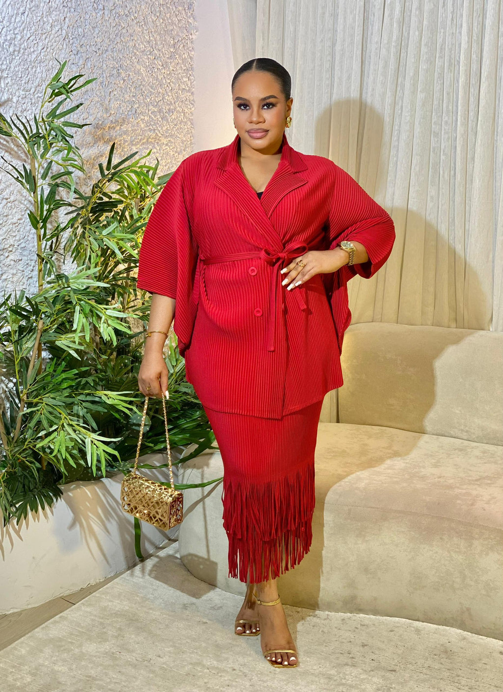 This elegant two-piece set combines refined sophistication with modern charm. Featuring a belted top with a flattering fit and a skirt adorned with stylish fringe detailing, this ensemble exudes effortless glamour. Perfect for formal events or chic occasions, it offers a blend of comfort, style, and versatility that makes it a standout in any wardrobe.