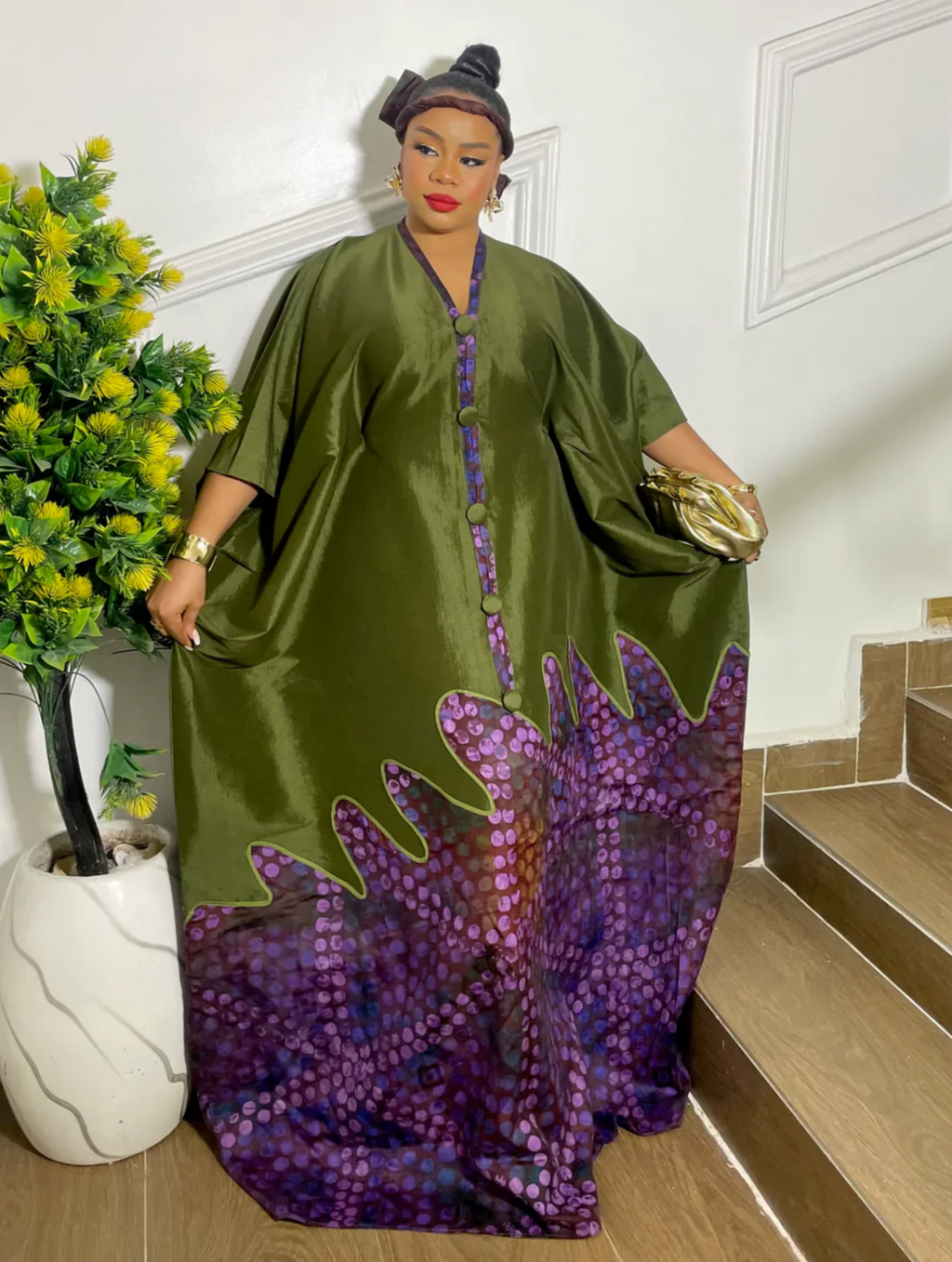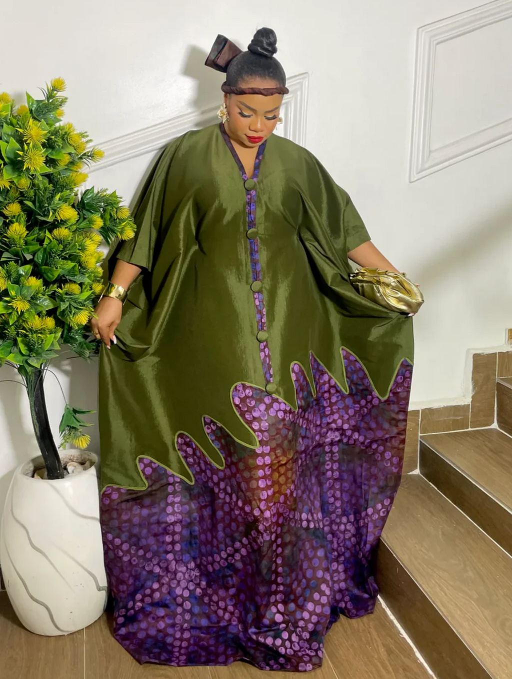 A vibrant fusion of lemon green and rich purple Adire patterns, this bubu features a hidden side rope to cinch your waist for a flattering fit. It comes with a matching scarf as seen on the model. A perfect blend of bold culture and timeless elegance.
