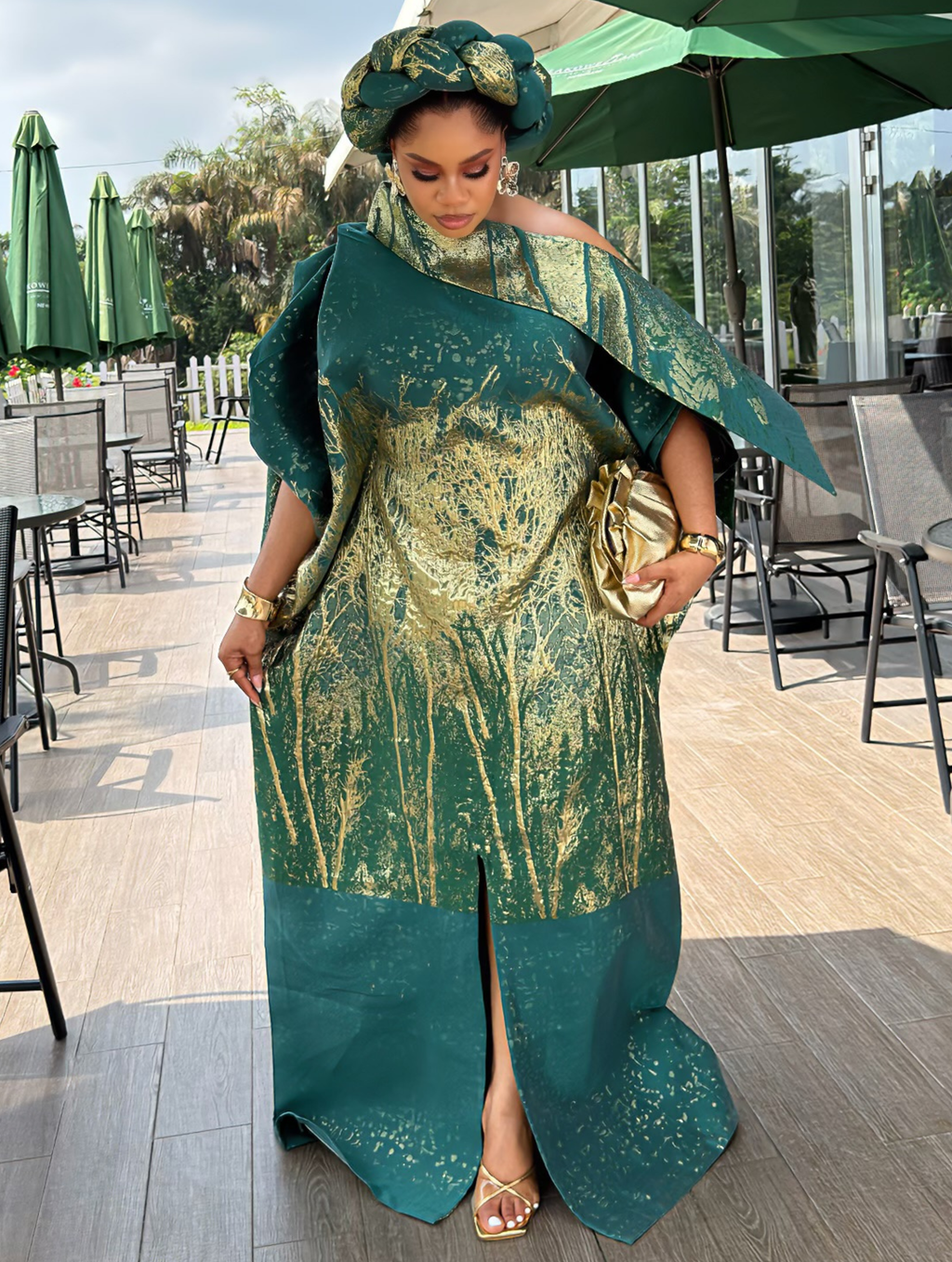 Experience effortless elegance in this premium brocade Bubu—crafted to flow freely with a rich, regal finish. Designed with an off-shoulder silhouette, a tailored inner belt to cinch your waist for a flattering fit, and a matching headband to complete your queenly look. Perfect for any occasion where luxury is the dress code..