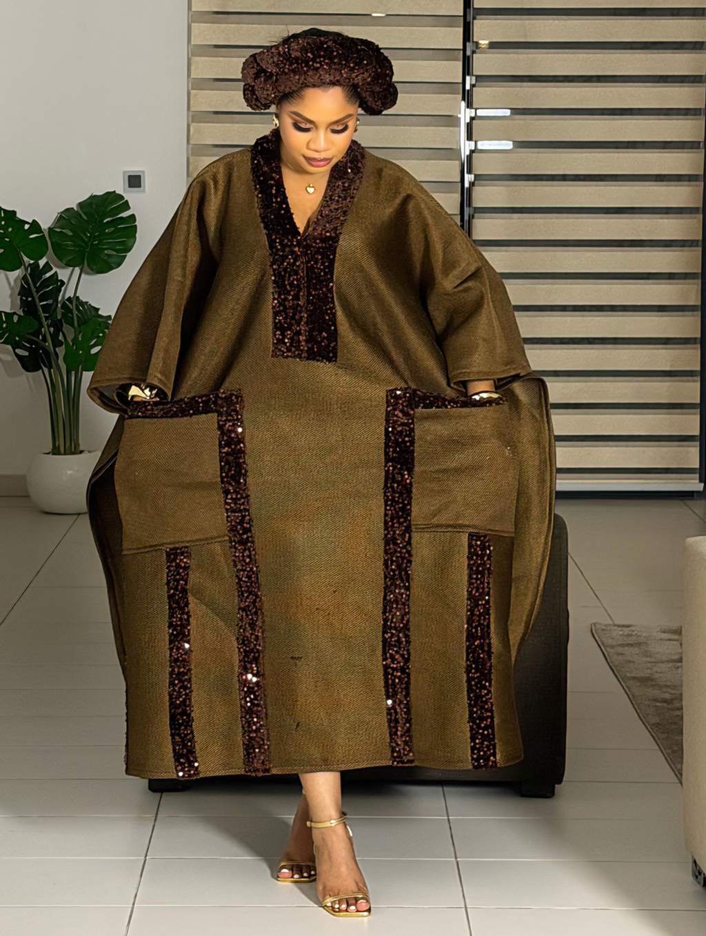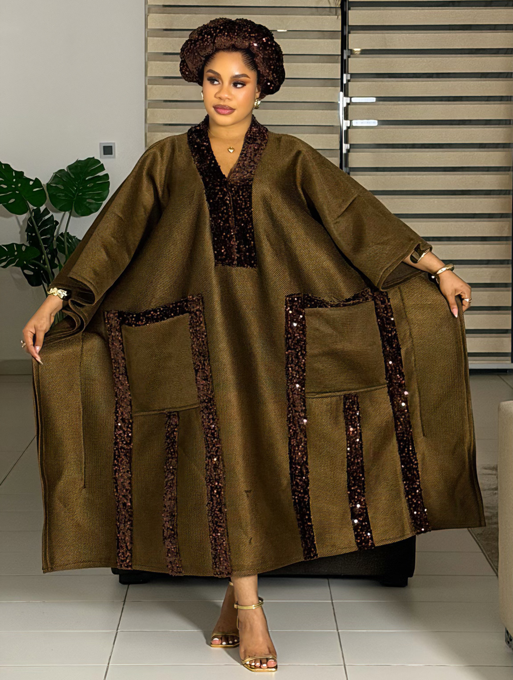 Crafted from rich scuba net fabric and adorned with bold sequin detailing, this statement piece combines structure and sparkle effortlessly. It features two deep front pockets and comes with the matching headpiece as seen on the model. Perfect for standing out at any occasion.