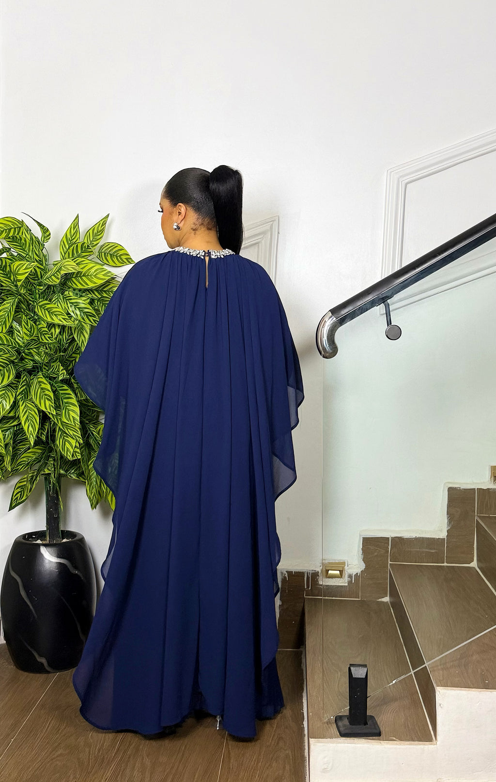 The Royal Cape DressCrafted for the woman who loves timeless luxury, this stunning maxi dress features a high gathered neckline adorned with an embellished collar detail that frames the face beautifully. The dramatic cape drape and flowing pleated dress create a soft royal movement, while the waist belt defines your shape for a flawless finish.This piece is ideal for weddings, special dinners, celebrations, church, birthdays and any moment you want to look effortlessly expensive.