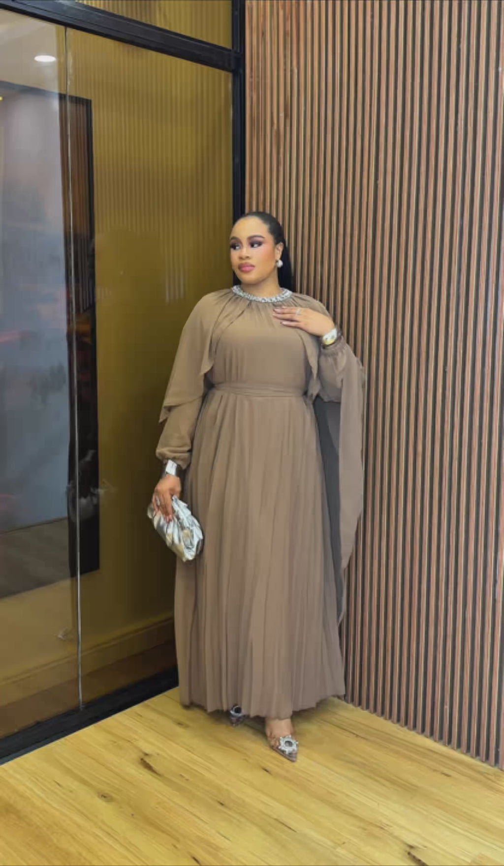 The Royal Cape DressCrafted for the woman who loves timeless luxury, this stunning maxi dress features a high gathered neckline adorned with an embellished collar detail that frames the face beautifully. The dramatic cape drape and flowing pleated dress create a soft royal movement, while the waist belt defines your shape for a flawless finish.
