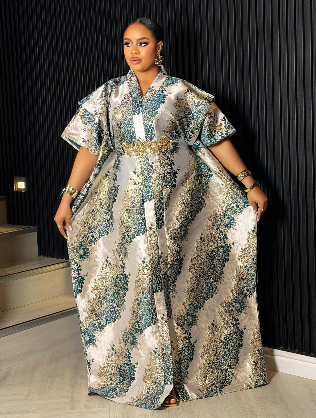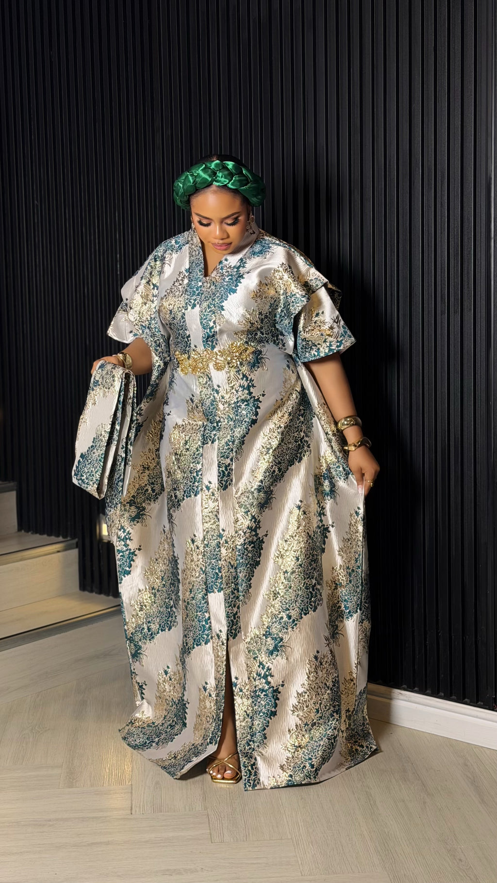 Luxurious brocade bubu designed for elegance and comfort. It features two tailor straps inside the dressone on the left and one on the right side. Simply take both straps to the back and tie them to snatch your waist and give you a more defined fit. This game-changer belt inside the bubu helps shape the dress so it doesnt feel too big while still keeping the beautiful flowing style.