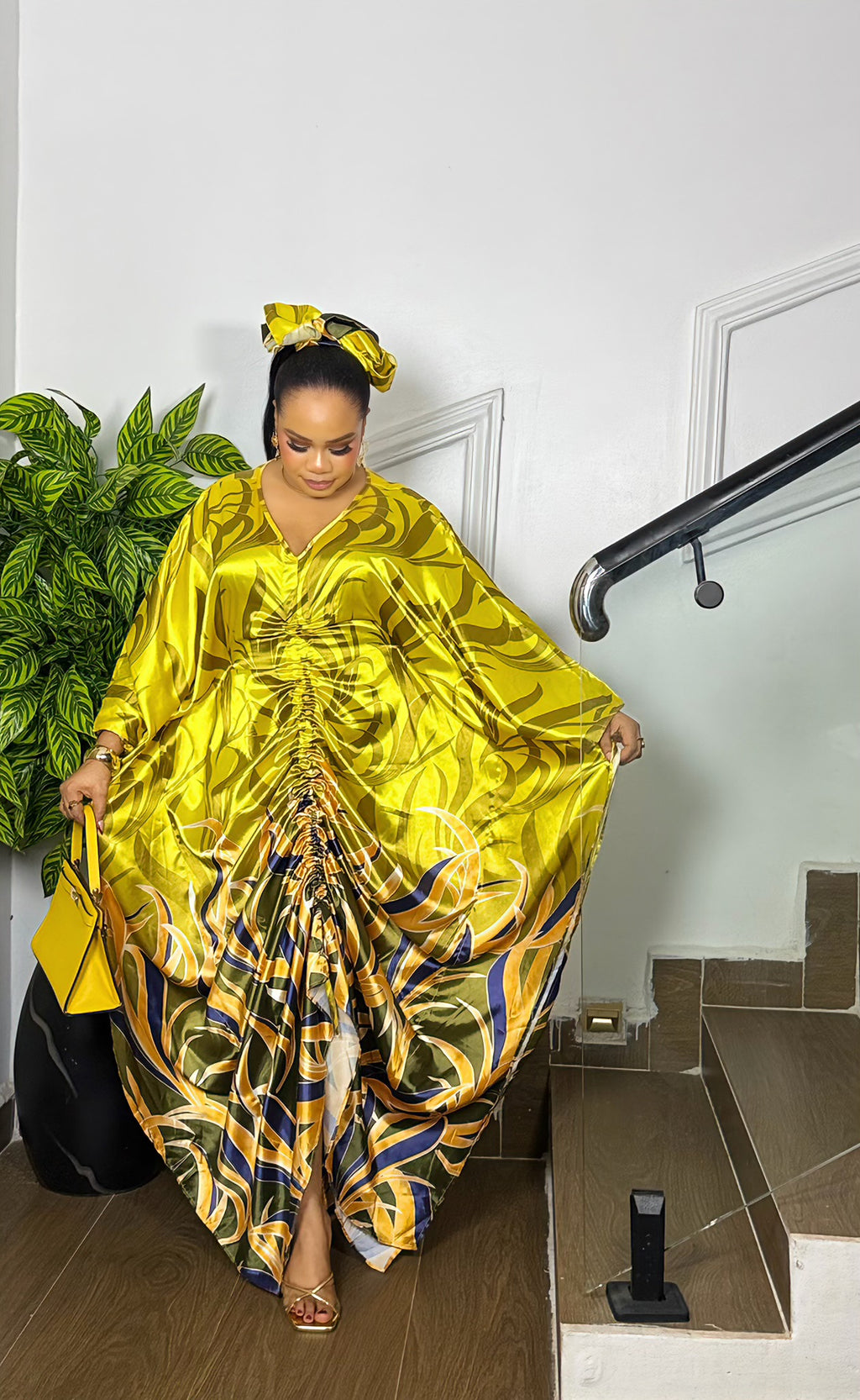 Designed for timeless elegance, this statement silk gown features a flattering V-neckline and a luxe center ruching that creates a beautiful draped effect. With its flowy silhouette, bold print, and radiant shine, it delivers effortless luxury in every step. Finished with a hidden inner belt for waist definition and a matching scarf, this piece is the perfect blend of comfort, class, and regal beauty.